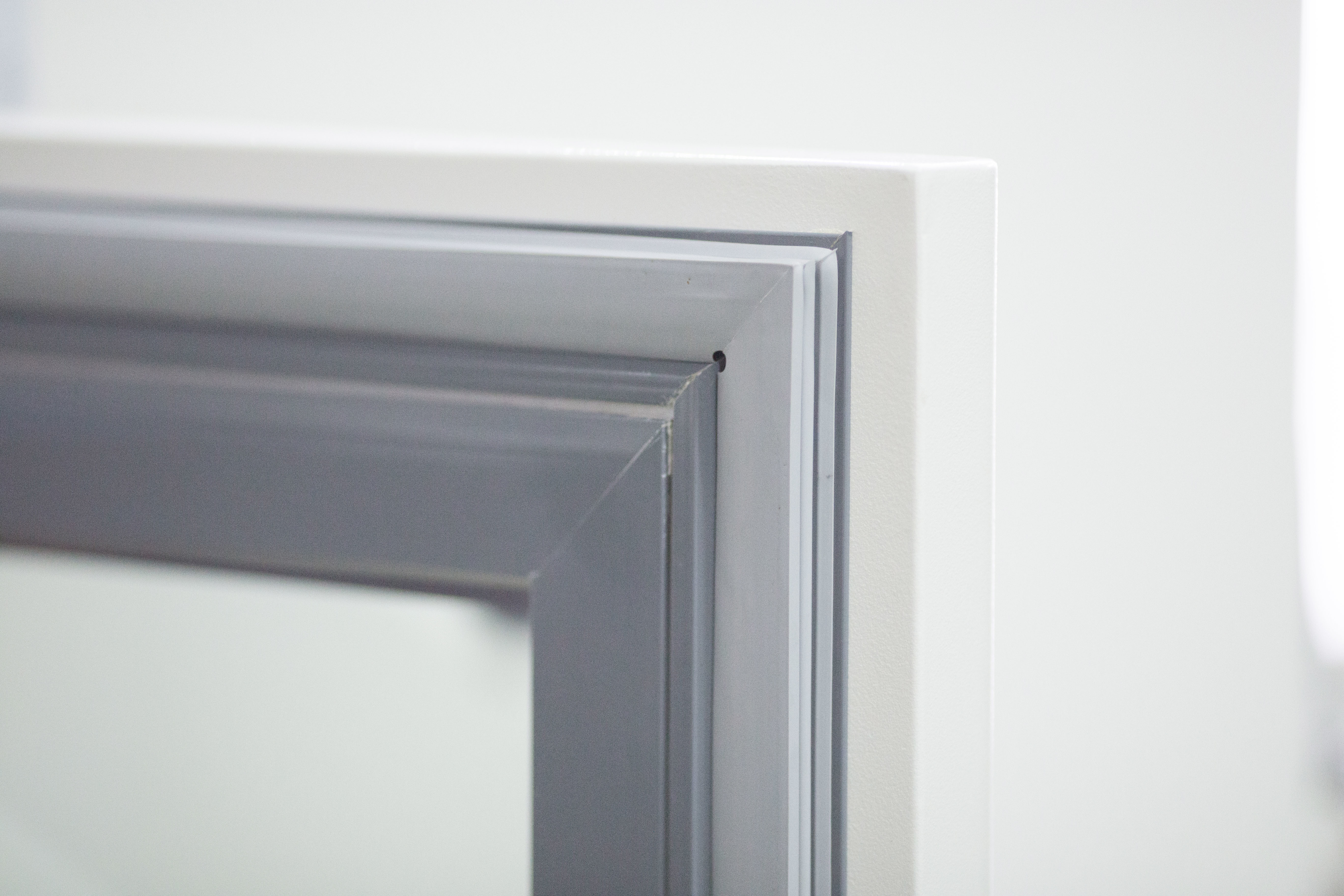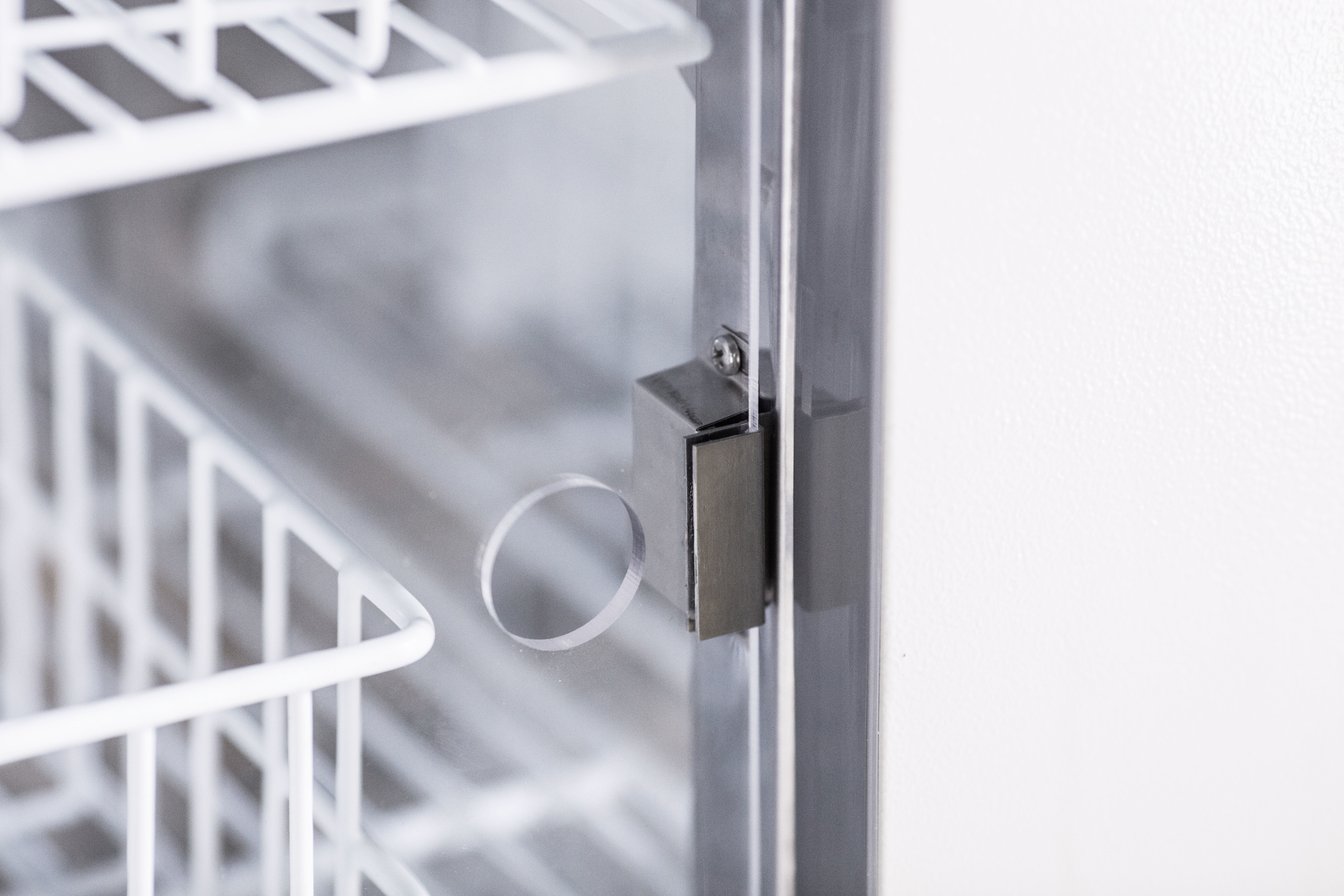 Pintu kaca bertulang tiga dengan pemanas untuk menghindari kondensasi.